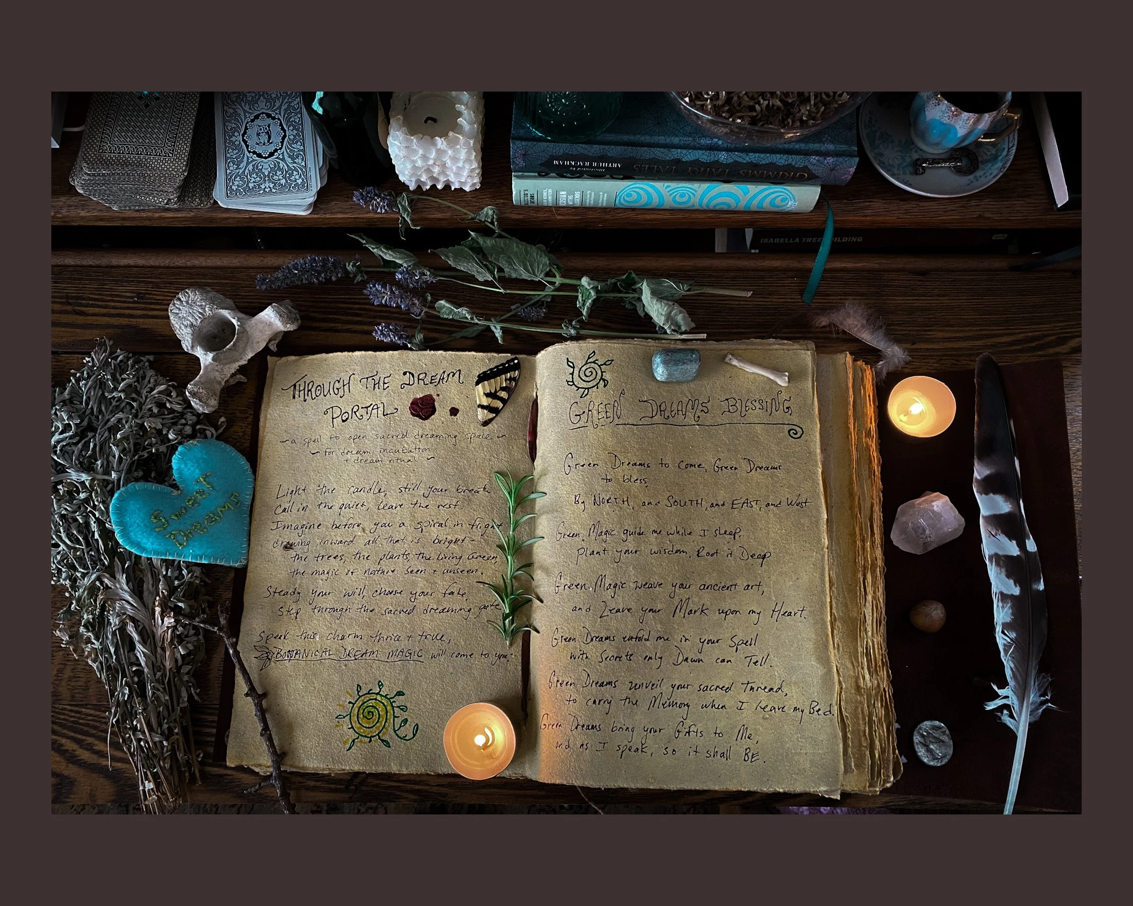 This spell arose while I was writing Herbal Dream Magic—my new book that is being released this fall – as an incantation to open sacred dreaming space, to mark the beginning of a dream ritual, and to invite the wisdom of the living green earth into the dreamtime. It is meant to be spoken slowly, with intention, as a way of signaling to both body and spirit: the dream gate is opening now.